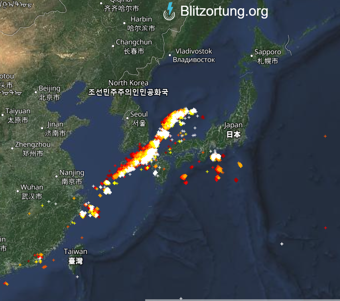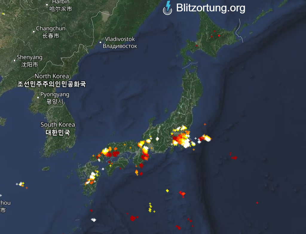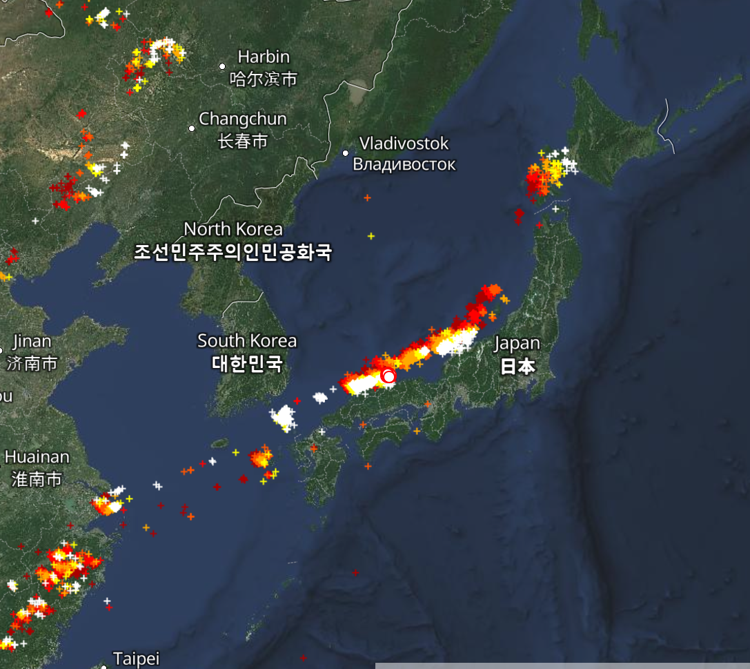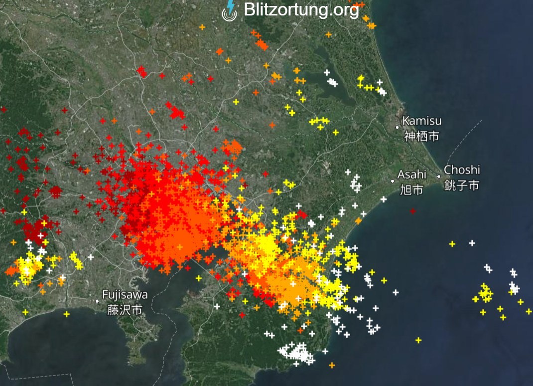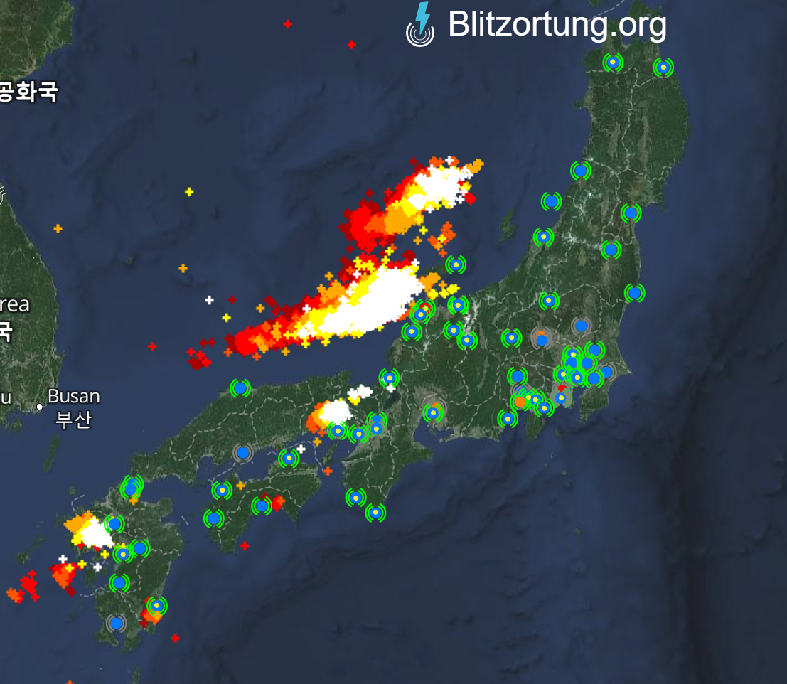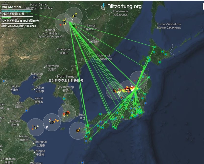 寒冷前線が停滞しているため、同じ場所への落雷が多く発生しています。