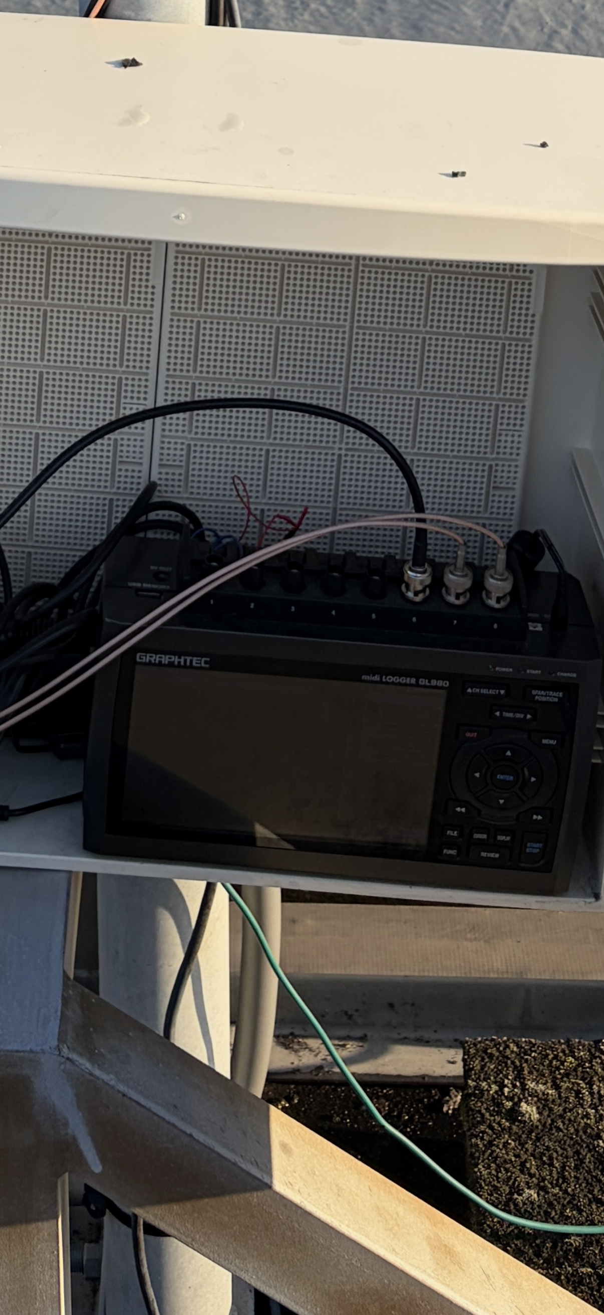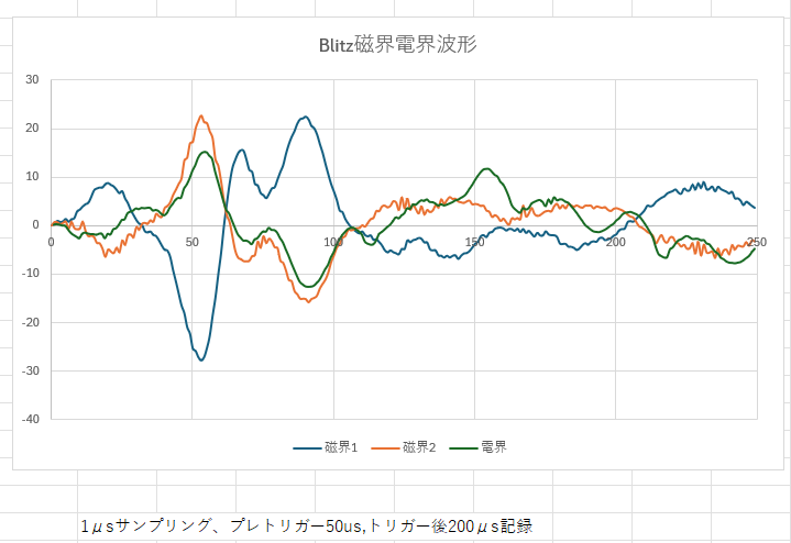 藤沢局の波形記録 藤沢局No.1925のアンプ増幅後にアナログ信号を取り出して、データロガーGL-980にて波形を記録出来るようにしました。サンプリング1μ秒、トリガー前後50+200μ秒を記録します。電界1ch、磁界2chです。
